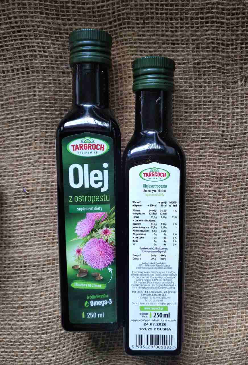 Składniki: Opakowanie zawiera 250ml oleju z ostropestu tłoczonego na zimno (100%).