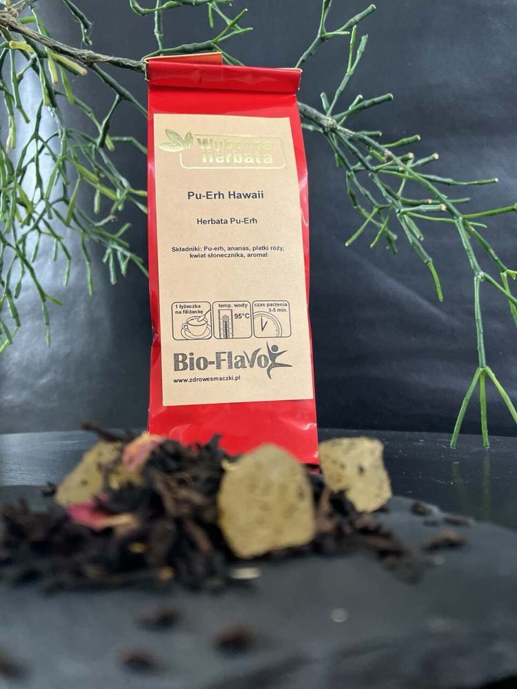Taniej w zestawie!Herbata czerwona Pu Erh Hawai 50g Flavo to wspaniała mieszanka herbaty Pu Erh, owoców ananasa, płatków róży i słonecznika. Można zaparzać kilka razy zalewając wrzątkiem przez 3-5 minut. Pita regularnie po posiłkach wspomaga odchudzanie.